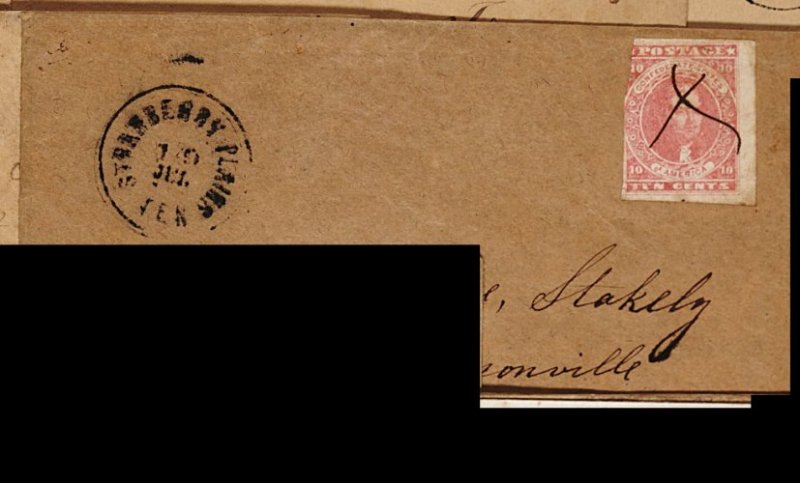 1231 c 5 image#5, 10c Rose, three large margins, cut in at left, bright rose color and very clear impression, manuscript pen cancel on homemade brown cover, postmarked with "Strawberry Plains, Ten./19 Jul" c.d.s. at left, addressed to Miss Carrie Stakely, Madisonville, E. Tenn.; Strawberry Plains, while a very small eastern Tennessee community, was a logistically important railroad depot that was both fought over and utilized by both Union and Confederate troops at various times during the war; very fine and attractive. (Image) Est. 500-750