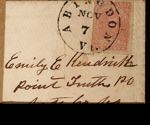 1232 c 5 image#5, 10c Dull rose, three large to ample margins, cut in on left, minor corner crease at upper left, tied by large "Abingdon, Va./Nov 7" c.d.s. to lovely petit embossed ladies cover, addressed to Miss Emily Kendrick, Point Truth P.O., Scott Co., Va.; both small communities in 1862, Abingdon (250 inhabitants) and Point Truth (less than 30 inhabitants) are located in the mountainous region of far southwest Virginia; insignificant overall toning, flap at back has been replaced, very fine for this; an extremely rare rural usage of this issue. (Image) Est. 500-750