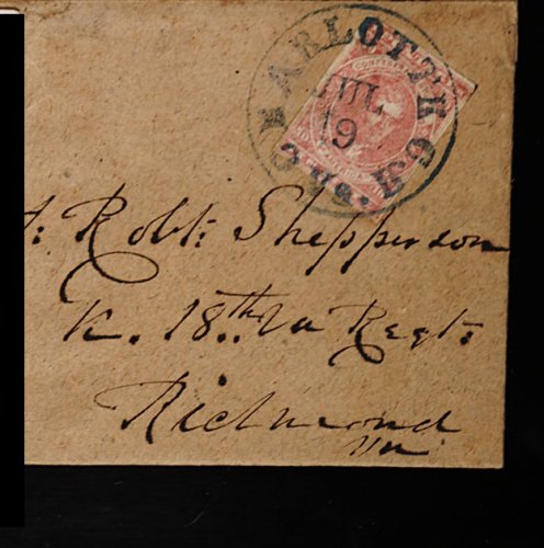 1233 c 5 image#5, 10c Rose, large to ample margins all around, bright pastel shade, tied by impeccable blue "Charlotte C.H., Va./Jul 9" c.d.s. to homemade brown cover to Richmond, Va., flap at back has been replaced, still very fine and exceedingly attractive. (Image) Est. 500-750