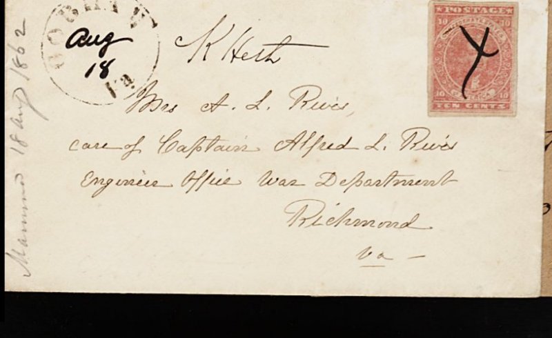 1234 c 5 image#5, 10c Rose, four particularly large and even margins all around, warm rose shade, on exceptionally clean small cover with manuscript pen cancel, very fine strike of "Cobham, Va./Aug 18" c.d.s. to left, addressed in care of Captain Alfred L. Reves, Engineer Office War Department, Richmond, Va., additionally docketed "Mamma 18 Aug 1862" at left; an early rail stop, Cobham was the home of the Piedmont Female Academy during the early 1860's; very fine. (Image) Est. 500-750