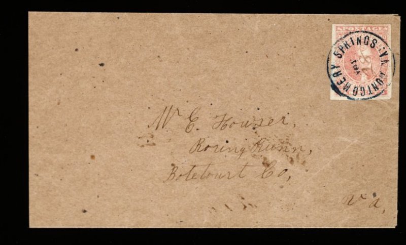1235 c 5 image#5, 10c Rose, select single with ample to mostly large margins, pretty pastel shade with clear impression, tied by a perfectly centered strike of a dark blue "Montgomery Springs Va./Nov 28 (manuscript)" c.d.s. to homemade brown cover, addressed to W.E. Houser, Roaring Run, Va., small enclosure accompanies, trivial reduction left, extremely fine; an very fresh and delightful 10c Rose cover inbound to a tiny western Virginia community; 2001 CSA certificate. (Image) Est. 750-1,000