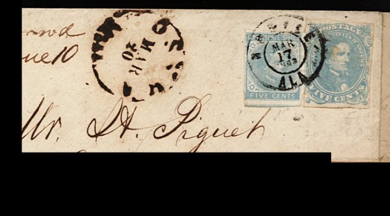 1238 c 6,4b image#6, 4b, 5c Light blue, London printing and 5c Light milky blue, Stone 2, large to ample margins, a few trivial creases, both tied by a "Mobile Ala/Mar 17 1863" c.d.s. to cream cover, addressed to Mr. H Piquet, Osyka, Miss. then forwarded to Summit, Miss., "Osyka Miss./Mar 20" transit c.d.s. and manuscript "Forwd Due 10" at upper left, some minor wrinkles, still very fine; a scarce and eye-appealing combination franking. (Image) Est. 300-400