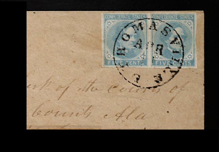 1240 c 6 image#6, 5c Light blue, London printing, horizontal pair with ample to large margins, very bright color and clear impression, tied by superb "Thomasville Ga./Apr 11 (1863)" c.d.s. on light brown cover, addressed to Greenville, Ala., extremely fine; a fresh and delightful example of this issue on cover. (Image) Est. 100-150