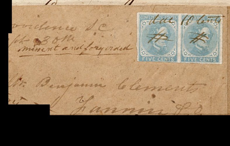 1243 c 6 image#6, 5c Light blue, London printing, horizontal pair with mostly large margins, just cut in at bottom left, fresh pastel shade with clear crisp impression, canceled by pen stroke with "Providence, S.C., Sept 30th" manuscript postmark at left, addressed to Mr. Benjamin Clements, Fannin, Mississippi, docketed "missent and forwarded" with stamps being tied to cover by postmaster's manuscript "due 10 cents", a very fine and attractive forwarded item. (Image) Est. 100-150
