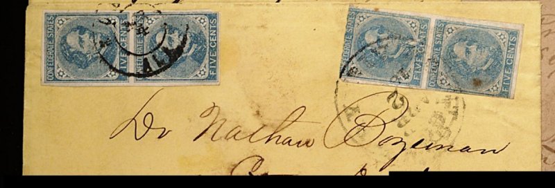 1244 c 7 image#7, 5c Blue, Local printing by Archer & Daly, vertical pair with upper stamp (pos. 30) displaying the "white necktie" variety, mostly large to ample margins, cut in at top and lower left, tied by unobtrusive "Montgomery, Ala./Apr 2 18(63)" c.d.s. to yellow cover, addressed to Mobile, Ala. then forwarded to Wetumpka, Ala. with an additional vertical pair, large to ample margins, cut in at lower right, tied by "Mobile, Ala./Apr 4 (1863)" c.d.s., tear to flap on back, still extremely fine; a wonderfully attractive and desirable forwarded usage. (Image) Est. 500-600