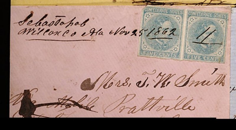1246 c 7 image#7, 5c Blue, Local printing by Archer & Daly, horizontal pair with ample well balanced margins, just cut into at upper left corner, warm rich color, cancelled by pen stroke and tied by manuscript "Sebastapol/Wilcox Co. Ala/Nov 25 1862" to petite pink ladies cover, addressed to Mrs. T.W. Smith, Prattville, Ala., slightly reduced at left, still very fine; an absolutely delightful little cover from a tiny community southwest of Montgomery. (Image) Est. 100-150