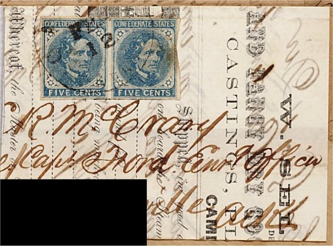 1247 c 7 image#7, 5c Blue, Local printing by Archer & Daly, horizontal pair with mostly large to just touching margins all around, tied by light discernible "Camden, Ark./Feb 12 (1863)" c.d.s. to military dispatch written on partial W. Sells & ___ , dry goods shipping form, addressed to Dr. E.R. McCrary, Lewisville, Ark., message is datelined "Hd Qtrs 4 Div/Camden/Feb 9/63" and requests information on the location of the doctor's assistants, insignificant edge repair, very fine and attractive Arkansas usage. (Image) Est. 200-300