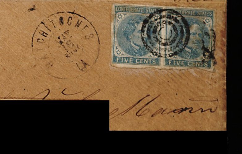 1248 c 7 image#7, 5c Blue, Local printing by Archer & Daly, horizontal pair with ample to large margins all around, usual aging spots due to usage on the homemade brown envelope, tied by circular grid cancellation with "Natchitoches, La./May 16 1864 (year inverted)" at left and addressed to Miss R.H. Mann, San Antonio, Texas, natural paper wrinkles, flap on back has been replaced, still a very fine central Louisiana usage and routing. (Image) Est. 100-150