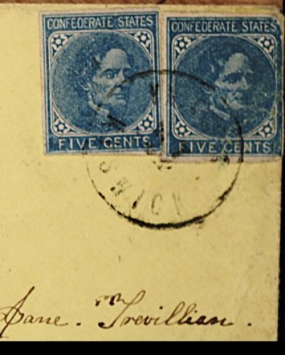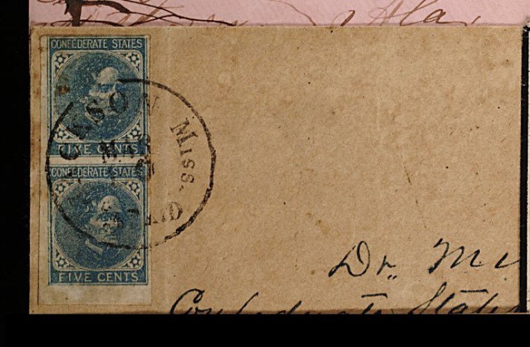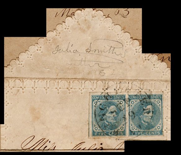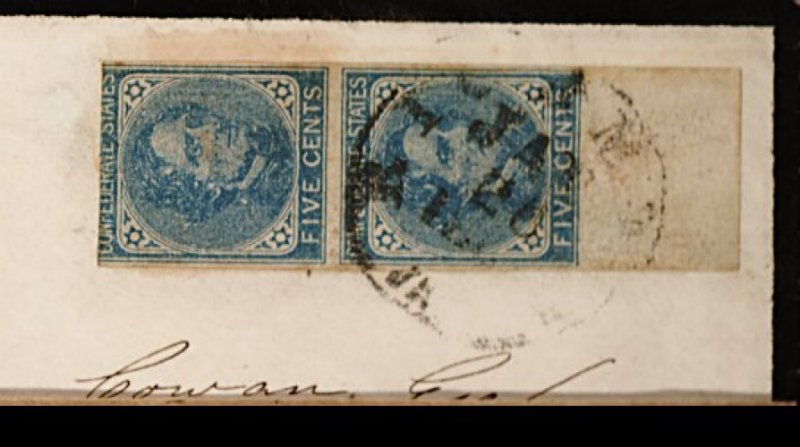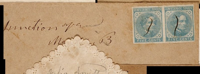 1253 c 7 image#7, 5c Blue, Local printing by Archer & Daly, horizontal pair, ample to large margins all around, warm rich color with clear impression, cancelled by pen stroke on homemade soldier's cover, manuscript "Junction Va./May 20 63" at left, addressed to Miss Martha Payne, Pittsylvania C.H., Virginia, interesting soldier's letter accompanies datelined "Camp near Hanover Junction, May 19th 1863", correspondence discusses the forced "march for sometime from Suffolk", details concerning "Yankee prisoners", and general information on camp life and rations, extremely fine for this; enclosure gives an insightful look into the day to day life of a Confederate soldier. (Image) Est. 200-300