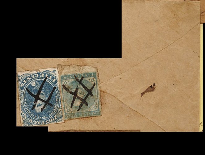 1251 c 7,4 image#7, 4, 5c Blue, local printing by Archer & Daly and 5c Blue, Stone 2, each with trivial faults, both cancelled by pen stroke sealing the backflap of a homemade cover, left stamp placed over original wax seal, front is docketed "Stamp on Back" with manuscript "Afton Va/Aug 21st" postmark, addressed to James A. Pannel, Johnson Light Artillery, Richmond, Va., slightly reduced at left, very fine for this; a superb example of the occasional primitive means by which letters were addressed and stamped. (Image) Est. 300-400