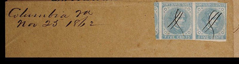 1252 c 7 image#7, 5c Blue, Local printing by Archer & Daly, horizontal pair, margins range from enormous to just cut in, showing a substantial portion of the adjoining stamp at left, delightful pastel shade with clear impression for a local printing, manuscript "Columbia Va/Nov 25 1862" postmark to left on brown cover, addressed to Edward Brown, Sunnyside P.O., Cumberland C(oun)ty, Va., letter accompanies which discusses the sale of land and slaves, "I am anxious to have the sale of the land before Christmas and also a division or sale of the negroes as the Court may direct.", insignificant reduction to cover at left, very fine and fresh. (Image) Est. 100-150