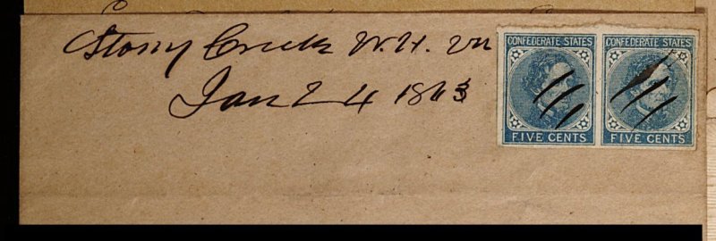 1255 c 7 image#7, 5c Blue, Local printing by Archer & Daly, impeccable horizontal pair with large balanced margins, showing portion of adjoining stamp at left, warm rich color, cancelled by multiple pen strokes with manuscript "Stony Creek W.H. (Warehouse) Va./Jan 24 1863" postmark to left on fresh brown cover, addressed to Alexander Donnan, Petersburg, Va., light fold far away from stamps, extremely fine with a very scarce town cancel. (Image) Est. 100-150