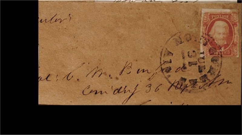 1258 c 8a image#8a, 2c Pale red, just cut in to large margins, warm rich shade, trivial gum stain upper right, tied by "Montgomery Ala./Jul 31" c.d.s. to brown homemade cover which carried a mailed circular, addressed to Col. C.W. Binford, Camden, Wilcox Co., Ala., reduced at right with some trivial surface scrapes and repairs, still very fine and attractive; a scarce rate to find with a contemporaneous circular docket. (Image) Est. 1,000-1,500