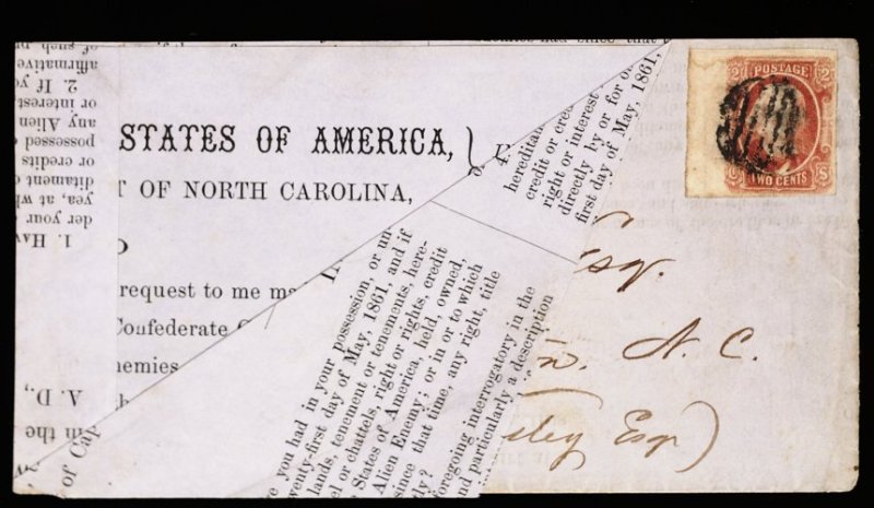 1259 c 8 image#8, 2c Red brown, select left sheet-margin single with ample to enormous margins, deep rich color, cancelled by enclosed circular grid on a stunning adversity cover made from a blue printed C.S.A. legal brief, addressed to L.D. Cherry, Wilmington, N.C., original Wilmington, August 19, 1863 enclosure on blue lined stationery accompanies, front has been opened for display, extremely fine; a very scarce drop letter with exceptional visual appeal; 2001 CSA certificate. (Image) Est. 1,500-2,000