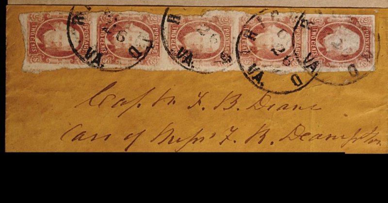 1260 c 8 image#8, 2c Red brown, vertical strip of four and single, the large strip with huge margins to just cut in at left, showing a portion of the adjoining stamp at bottom right, the single (stamp at right), which is not contemporary, has large margins all around, tied by multiple strikes of a "Richmond Va./Oct 26" c.d.s. to orange cover addressed to Lynchburg, Va., flap at back has been replaced, very fine appearance despite the addition of one stamp. (Image) Est. 500-750