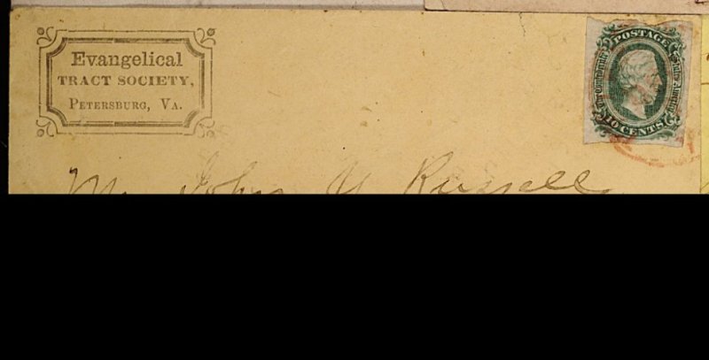 1281 c 11d image#11d, 10c Green, Die A, three large margins, irregularly separated at top, warm green shade, tied by light but discernible red "Petersburg Va./Dec 7" c.d.s. to buff cover with printed Evangelical Tract Society corner card, addressed to John Russell, Lynchburg, Va., trivial wrinkling, very fine for this. (Image) Est. 150-200