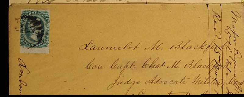 1283 c 11c image#11c, 10c Greenish blue, Die A, massive margin at bottom, showing portion of adjoining stamp, just cut in at sides, bright color, tied by Army of Northern Virginia nine bar grid cancel (Dietz Ty ANV 4 UG) to fresh orange cover, addressed to Launcelot M. Blackford, care of Capt. Chas. M. Blackford, Judge Advocate Military Court, Longstreets Corps, Army of the Tennessee, docketed "Major Eugene Blackford, 5th Ala. Inf., Recd 15 Nov 1863"; natives of Virginia, these Blackford brothers all survived the war to return to their respective professions; extremely fine and interesting. (Image) Est. 100-150