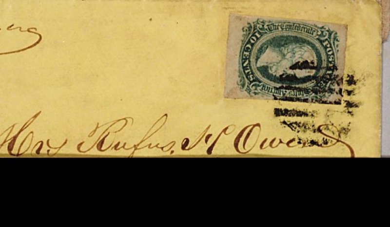 1284 c 11d image#11d, 10c Green, Die A, large to ample margins, deep green shade , tied by Army of Northern Virginia seven bar grid cancel (Dietz Ty ANV 7 UG) to lemon yellow cover docketed "via Richmond", addressed to Mrs. Rufus Owens, Wolf Trap P.O., Halifax County, Virginia, tear to flap at back, very fine; a wonderful color combination on cover to a tiny southern Virginia community. (Image) Est. 150-200