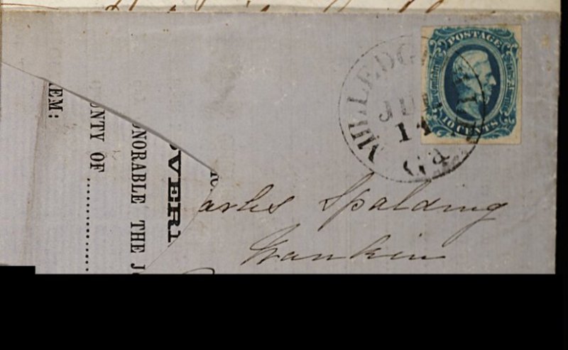 1285 c 12 image#12, 10c Blue, Die B, three large margins, just cut in at top, fresh bright color with crisp impression, tied by "Milledgeville Ga./Jul 14" c.d.s. to lovely blue adversity cover made from a Governor of Georgia's proclamation form, addressed to Col. Charles Spalding, Franklin, Brooks County, Georgia, flap at side turned to display form, very fine; an usually choice and attractive item. (Image) Est. 200-300