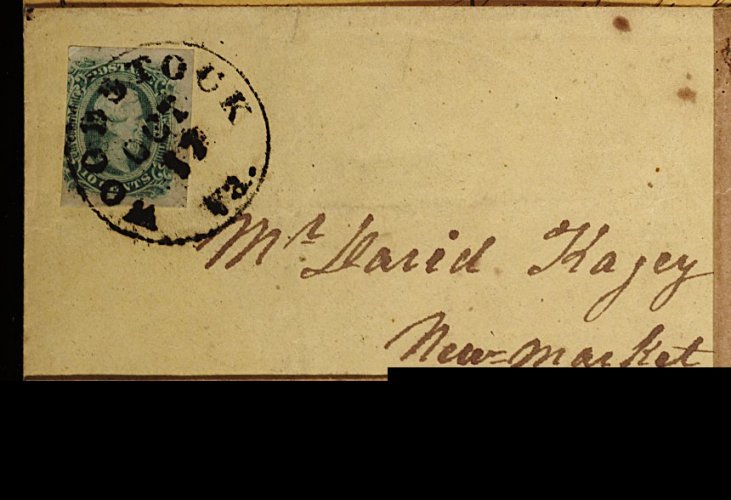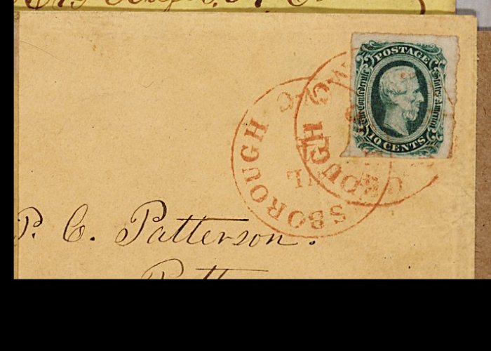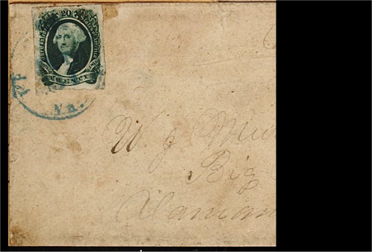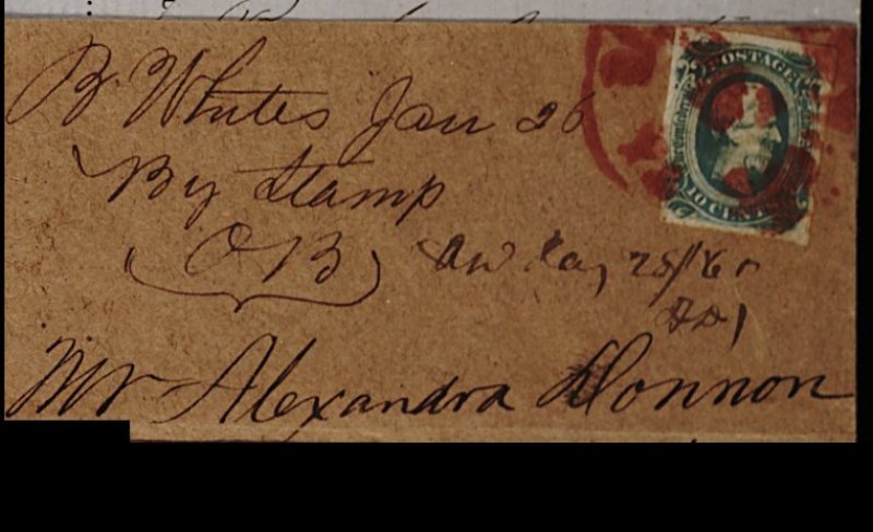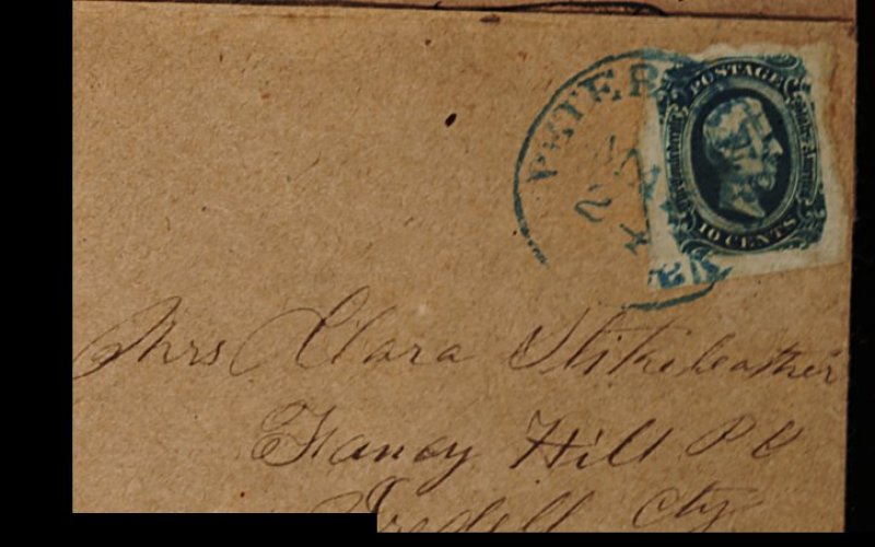 1288 c 12c image#12c, 10c Greenish blue, Die B, three large margins to just cut in at lower left, warm rich color, tied by red "Blacks and Whites Va/Jan 26 (1865)" c.d.s. to homemade brown cover, manuscript "B Whites Jan 26/By Stamp" postmark to left, docketed "OB" (Official Business) and addressed to Alexandra Donnon, Petersburg, Va.; a railroad town to the southwest of Richmond, Blacks and Whites was the scene of heavy fighting in 1864; light horizontal fold well clear of stamp, very fine; a delightful Nottoway County, Va. item. (Image) Est. 150-200