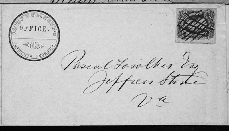 1287 c 12d image#12d, 10c Dark Blue, Die B, large to huge margins, showing portion of adjoining stamp to right, cancelled by multiple pen strokes on clean yellow cover with printed circular "Chief Engineer's Office Piedmont Railroad" corner card, addressed to Jeffess' Store, Va., tear to flap at back, still extremely fine; a very fresh railroad cover. (Image) Est. 100-150