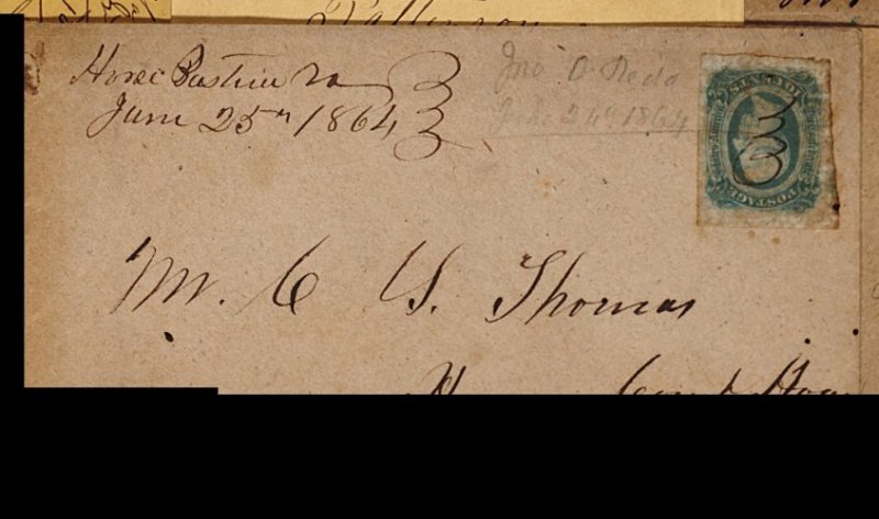1289 c 12b image#12b, Light blue, Die B, enormous margins all around, showing portion of adjoining stamp at left, mild overall gum toning, cancelled by fancy pen stroke with manuscript "Horse Pasture Va./June 25th 1864" postmark at left on dark brown homemade cover, addressed to Mr. C.H. Thomas, Henry Court House, Va., tear to flap at back, still very fine for this small southern Virginia community usage. (Image) Est. 100-150