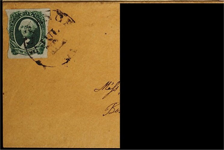 1294 c 13b image#13b, 20c Dark green, large margins all around, vivid deep green shade, tied by light blue "Petersburg Va./(Ja)n 31" c.d.s. to buff cover probably paying the double letter rate, addressed to W.J. Murray, Shff., Big Falls, Alamance County, N.C., docketed "O.B." (Official Business) at top, lightly soiled with pieces of flap at back missing, still rare and very fine; signed Sloane. (Image) Est. 1,000-1,500