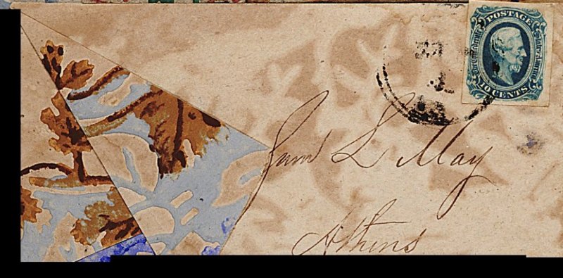 1341 c 12d image#12d, 10c Dark blue, Die B, select single with large to enormous margins, deep shade and clear impression, tied by indistinct (probably Georgia) c.d.s. to rich brown and multiple blue tone floral wallpaper cover, addressed to Sam L. May, Athens, Ga., turned at side for display, minor edge wear and erosion spots at back, still very fine and attractive. (Image) Est. 200-300
