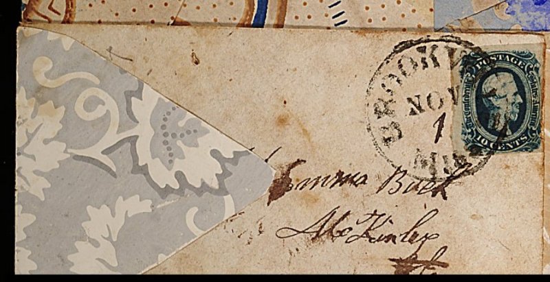 1342 c 12d image#12d, 10c Dark blue, Die B, ample to large margins on three sides, just touching at right, deep blue shade, tied by "Brookville Miss./Nov 1" c.d.s. to pale gray and white floral wallpaper cover, addressed to Miss Emma Buck, McKinley, Ala, a few trivial age spots, very fine for this. (Image) Est. 300-400