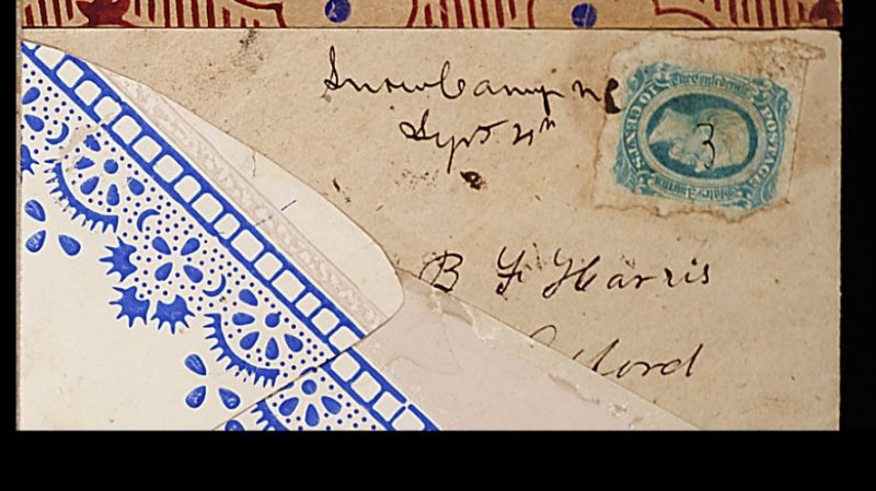 1344 c 12a image#12a, Milky blue, Die B, left sheet-margin single with close to enormous irregular margins, bright color, tied by manuscript "Snow Camp NC/Sept 4th (1863)" postmark to small blue and white frieze design wallpaper cover, addressed to B.F. Harris, Oxford, N.C., opened for display, one flap at back has been replaced, still very fine; a scarce item from this tiny Alamance Co. community. (Image) Est. 300-400