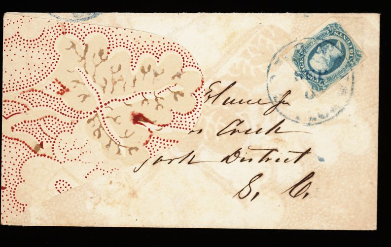 1345 c 12 image#12, 10c Blue, Die B, large to just touching margins, strong color and clear impression, tied by blue "Columbia S.C./Sep 6" c.d.s. to lovely red, cream and gold floral wallpaper cover, addressed to Taylors Creek, York District, S.C., flap at side turned for display, extremely fine; a striking combination of colors. (Image) Est. 300-400