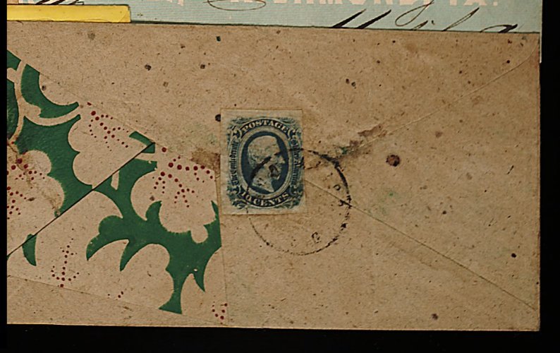 1347 c 12 image#12, 10c Blue, Die B, three large to enormous margins, just cut in at right, warm rich color, expertly repaired tear at bottom, tied and sealing flap at back with light but discernible "Pocotalico S.C." c.d.s. to green and red on brown floral wallpaper cover, addressed to Rev. Jas. C. Furman, Greenville, S.C., flap at side turned down for display, slightly reduced with sealed tear, very fine for this. (Image) Est. 300-400