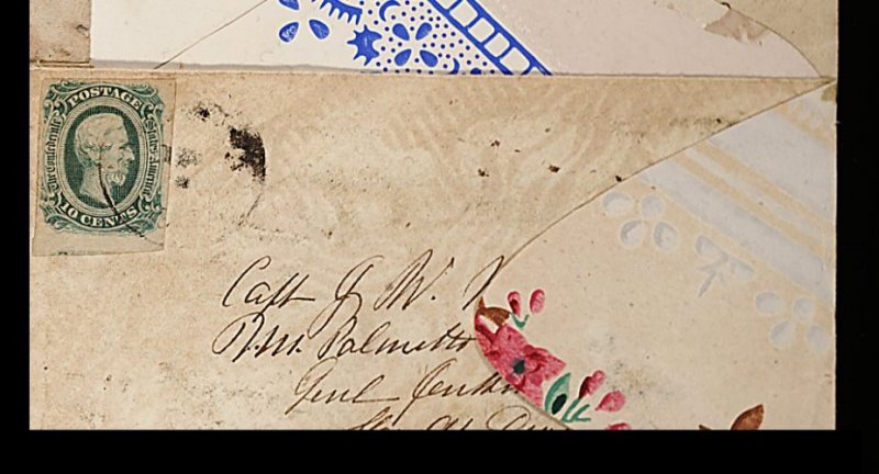1348 c 12c image#12c, 10c Greenish blue, Die B, ample to huge margins, showing portion of adjoining stamp at bottom, warm rich color, tied by indistinct c.d.s. to pretty pink, green and brown floral wallpaper cover, addressed to Capt. J.W. McLure, Palmetto Sharpshooters, Genl Jenkins Brigade, Hoods Division, Longstreets Corps, Morristown, East Tenn., flap at side turned for display, trivial erosion to flap, very fine and attractive. (Image) Est. 300-400