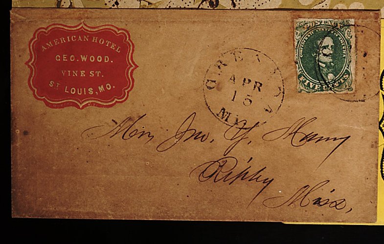 1349 c 1 image#1, 5c Green, Stone 1 or 2, two covers, each having singles with just cut in to large margins, both showing portions of adjoining stamps, the first is tied by a light "Grenada Miss./Apr 15 (1862)" c.d.s., with matching c.d.s. to left, to brown cover with embossed red American Hotel corner card, addressed to Jno. Y. Muny, Ripley, Miss., the second is tied by partial Corinth, Miss. c.d.s. with a dark blue corner card of the same design, addressed to the same individual in the same hand, datelined original enclosure accompanies the latter discussing a Confederate soldier's camp life immediately following the Battle of Shiloh, some soiling and light wrinkling, still very fine for this. (Image) Est. 200-300