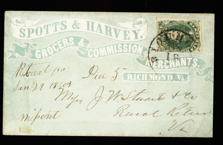 1350 1 image#1, 5c Green, Stone 2, large margins all around, warm rich color, tied by centrally struck "Richmond Va./Dec 8 (1861)" c.d.s. to blue-green all-over Wholesale Grocer advertising cover, addressed in flowing script to John R. Edmunds, News Ferry, Halifax Co., Va., trivial opening tear to flap at back, very fine; an exceptional cover with an early Stone 2 usage. (Image) Est. 300-400