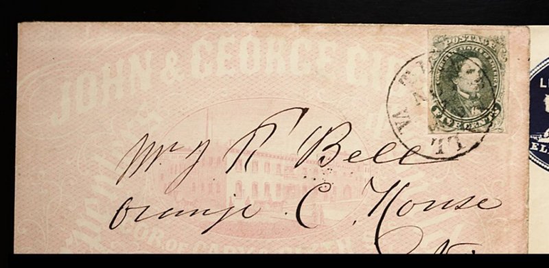 1353 c 1c image#1c, 5c Olive green, Stone 1, ample to large margins, light vertical preaffixing fold at far right, tied by "Tudor Hall Va./Nov 7 1861" c.d.s. to striking pink all-over illustrated Carpenters and Builders advertising cover, addressed to Mr. J.H. Bell, Orange C. House, Va., very slight reduction at right, extremely fine; a very early use of the 5c Olive green on an exceedingly attractive cover. (Image) Est. 400-500