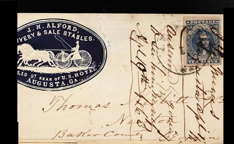 1354 c 2b image#2b, 10c Dark blue, Paterson printing, large to enormous margins all around, vivid dark shade, trivial tear just into design at upper right corner, tied by light but discernible "Augusta Ga./Apr 1 (1863)" c.d.s. to cover with exquisitely detailed cameo-like dark blue Livery & Sale Stable embossed corner card, addressed to Thomas Nesbitt, Newton, Baker County, Georgia, sealed tear at top, extremely fine appearance. (Image) Est. 200-300