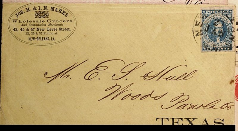 1355 c 2b image#2b, 10c Dark blue, Hoyer & Ludwig printing, lovely single with huge to enormous margins all around, warm rich color, tied by centrally struck "New Orleans La./20 Jan (1862)" c.d.s. to yellow cover with printed Wholesale Grocer corner card, addressed to Woods, Texas, interesting pre-printed block "TEXAS" for obvious regular correspondence sent to the state, dated commercial enclosure accompanies, some light edge wear at bottom left, trivial reduction right, very fine and quite attractive. (Image) Est. 300-400