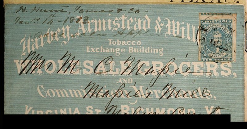1357 c 2 image#2, 10c Blue, Paterson printing, three large to enormous margins, just cut in at bottom, showing large portion of adjoining stamp at top, warm rich shade, tied by "Richmond Va./Jan (?) 1862" (year error) c.d.s. to blue all-over Wholesale Grocer advertising cover, addressed to Mr. M.C. Massie, Massie's Mill(s), Nelson County, Va., docketed "Jan 14th 1863" in manuscript at left, shallow flap erosion from opening, extremely fine; an attractive cover mailed to a tiny community at the foot of the Blue Ridge mountains. (Image) Est. 300-400