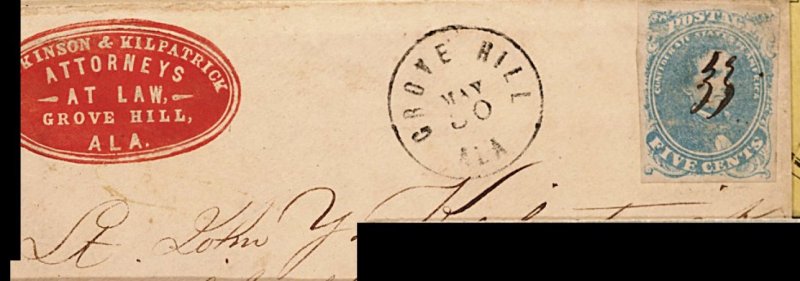 1358 c 4b image#4b, 5c Light milky blue, Stone 2, four large well balance margins, pretty pastel shade, small scissor cut just in at left, cancelled by pen stroke with "Grove Hill Ala/May 30 (1862)" c.d.s. to left on cover with embossed red Attorney corner card addressed to Lt. John Y. Kilpatrick, care of Capt. S.B. Cleveland of the Clarke County Rangers, Col. Wirt Adams Regiment, Corinth, Miss., with original enclosure concerning Wirt Adams & Co. banking receipts; Adams a native of Kentucky, was engaged in banking in Mississippi when he declined the Postmaster-Generalship of the Confederacy tendered him by Jefferson Davis when the government was organized, he instead raised the 1st Mississippi Cavalry who saw its first action at the the Battle of Shiloh in early April of 1862, just days after this correspondence was mailed to his camp in Corinth; insignificantly reduced at right, still very fine with tremendous historical interest. (Image) Est. 200-300