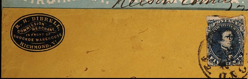 1360 c 4 image#4, 5c Blue, Stone 2 mostly ample irregular margins, slightly cut in at places, tied by Richmond, Va./(?) 22 1862" c.d.s. to bright orange cover with embossed dark blue Commission Merchant corner card, addressed to Elwood Davidson, Buckinghan Co.Ho., Virginia, small sealed tears in flap at back, still fine and attractive. (Image) Est. 200-300