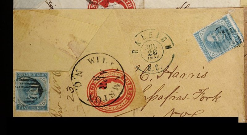 1381 c 6 image#6, 5c Light blue, London printing, two singles, one with large to huge margins, the other with faults, each tied by dark blue enclosed circular grid cancels with matching "Raleigh N.C./Jul 26 186(3?)" at center on turned 1855 3c Red Nesbitt cover, addressed to Sassafras Fork, N.C., original cover postmarked by a "Williamston N.C./Apr 3" c.d.s. and addressed to Raleigh, N.C., cover opened for display, slightly reduced left, very fine; an interesting and unusual U.S./Confederate usage to a tiny North Carolina community. (Image) Est. 200-300