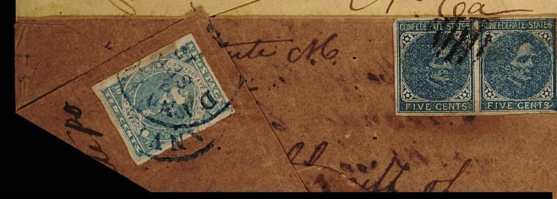 1383 c 7 image#7, 5c Blue, Local printing by Archer & Daly, horizontal pair, three large margins to cut in at right, cancelled by circular grid with manuscript "York Institute N.C./17th July" postmark to left on turned cover to Charlotte, N.C., inside bears handsome 10c Light blue (#2a) with huge to large margins, tied by blue "Danville Va./Sep 12" c.d.s., folded open for display, trivial erosion pin holes, very fine combination and usage. (Image) Est. 300-400