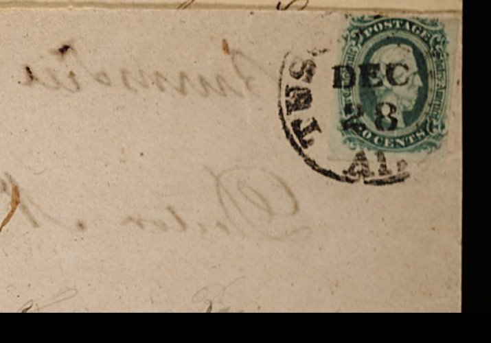 1384 c 11c image#11c, 10c Greenish blue, Die A, two singles, each with three large margins to just cut in, used on each side of a turned cover, first tied by a "Tuscaloosa Al./Dec 28" c.d.s. to Burnsville, Ala, second cancelled by pen stroke with manuscript "Burnsville Ala" postmark at left, one stamp with minor edge toning, cover opened for display, very fine. (Image) Est. 150-200