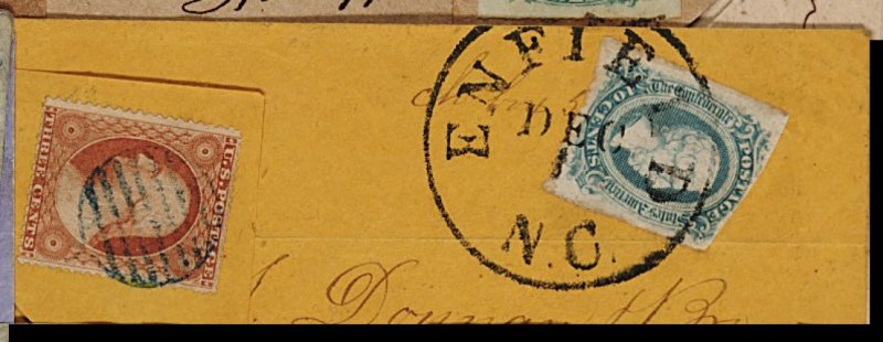 1386 c 11c image#11c, 10c Greenish blue, Die A, three large margins, just cut in at top, warm rich shade, tied by bold "Enfield N.C./Dec 1" c.d.s. to orange turned cover addressed to Petersburg, Va., first usage being U.S. 3c Dull red (#26) tied by attractive blue circular grid cancel, addressed to Enfield, lovely red wax flap seal still intact, cover opened for display, horizontal fold not affecting stamps, unusually clean and fresh, choice very fine. (Image) Est. 200-300