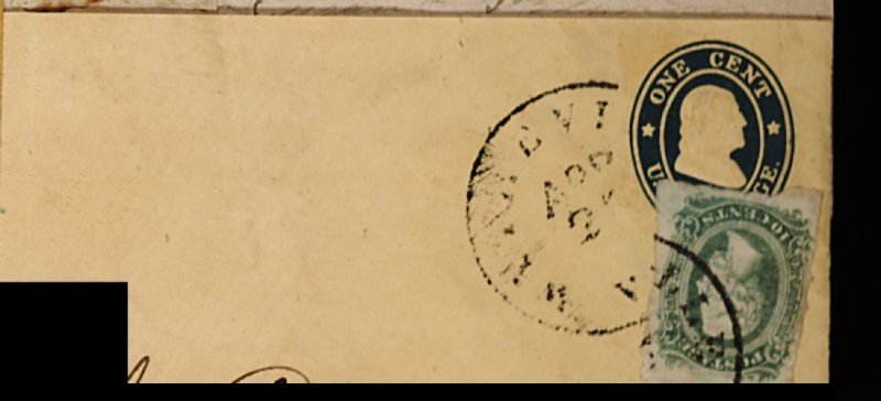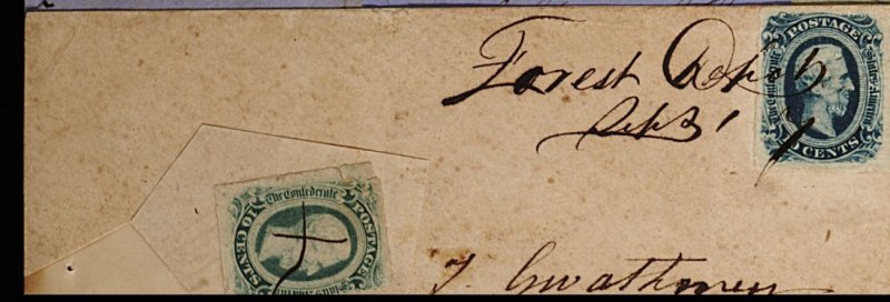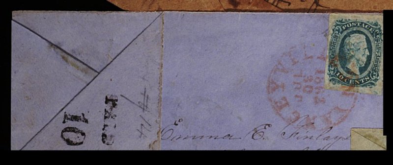 1391 c 12d image#12d, 10c Dark blue, Keatinge & Ball, Die B, striking single with large to enormous margins, vivid color and clear impression, tied by manuscript "Forest Depot" postmark addressed to Yellow Branch, Virginia, cover turned and reused with a 10c Greenish blue, Archer & Daly (#11c), torn at upper left corner, cancelled by pen stroke with manuscript "Yellow Branch Va./Jan 24" postmark at right, addressed to Charlottesville, Va., opened for display, minimal reduction at left, a few tiny filing holes, still very fine and attractive. (Image) Est. 200-300