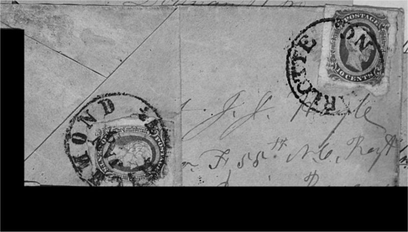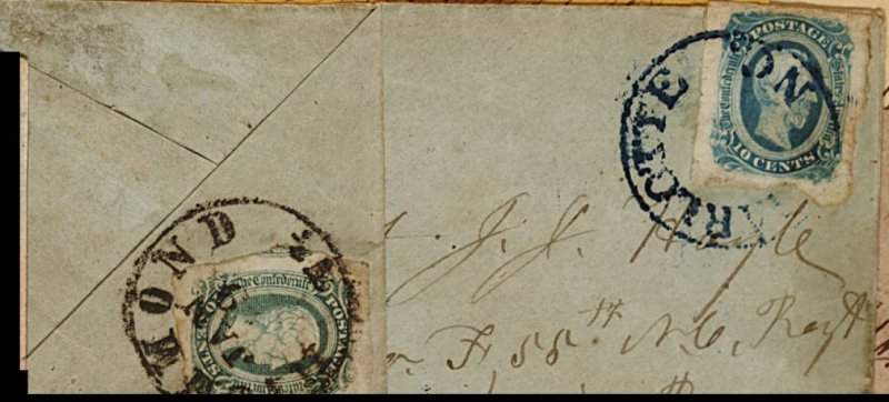 1390 c 12d image#12d, 10c Dark blue, Keatinge & Ball, Die B, large even margins, deep dark shade, cancelled by pen stroke with manuscript "Chula (Depot Va.)/March 20 1865" postmark, addressed to Richmond, Va., cover turned bearing a 10c Blue, Archer & Daly (#11) lower sheet-margin imprint single, showing the "aly, Bank" portion of the imprint, just clear to enormous margins, minor paper wrinkles, tied by "Richmond Va./Mar 25" c.d.s. addressed to Mossingford, Va., slightly reduced at left, very fine for this late war usage. (Image) Est. 200-300