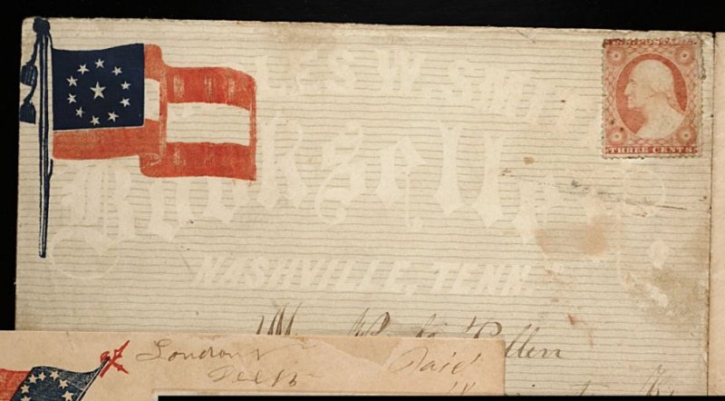 1395 c image11-Star Confederate Flag Patriotic design on a gray all-over Bookseller advertising cover, probably unused despite being addressed and franked with a 3c Dull red (#26), very trivial edgewear, still very fine and fresh. (Image) Est. 150-200