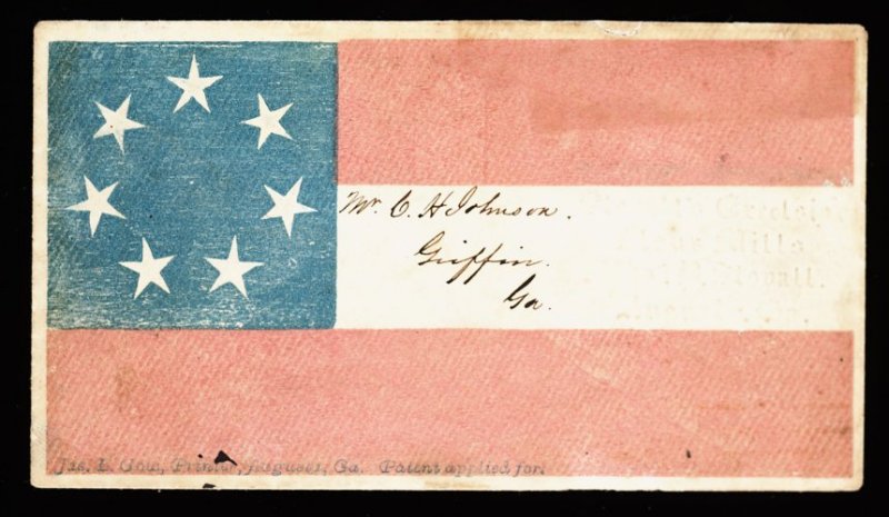 1396 c 26 image#26, 3c Dull red tied to flap at back by indistinct c.d.s. (probably Augusta Ga. early 1861) on red and blue embossed advertising 7-Star Confederate Flag Patriotic cover, "Stovall's Excelsior Flour Mills, Thos. M. Stovall, Augusta, Ga." imprint to right on white portion of flag design, addressed to Mr. C.H. Johnson, Griffin, Ga., blue printed Jas. L. Gow manufacturing imprint at bottom left, tiny sealed tear at top, a couple of flap faults not affecting stamp, very fine for this; all-over design flag patriotics are rare, however embossed advertising patriotics such as this one are in a unique class to themselves; ex-Van Dyk and MacBride. (Image) Est. 2,000-3,000