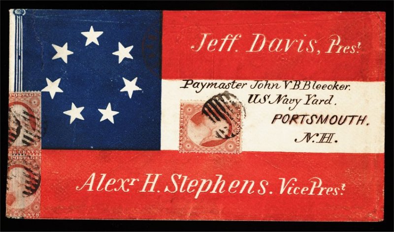 1397 c 26 image#26, 3c Dull red, one vertical pair, one single, pair has straight edge right and is folded over to back, tied by enclosed grid cancels to red and blue Davis-Stephens 7-Star Confederate Flag Patriotic cover addressed to Paymaster John V.B. Bleecker, U.S. Navy Yard, Portsmouth, N.H., red "Charlestown MS/Jun (?) 1861" c.d.s. strike at top (on red & blue flag background, visible from inside cover), this Massachusetts cancel would seem to indicate Northern use of a Confederate Patriotic shortly after termination of postal relations, small closed tear upper left, otherwise extremely fine and exceedingly choice; a very rare usage of U.S. stamps on a Confederate Patriotic. (Image) Est. 3,000-4,000